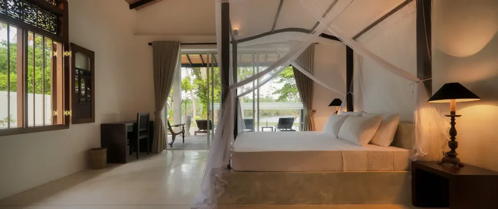 The villa is a study in natural harmony, crafted with cooling local stone, sustainable local woods, and rich, textured linens. Every space flows seamlessly, maximizing cross-ventilation and inviting the dappled light and the tranquil ocean air to settle within.